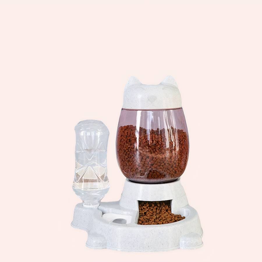 Pensé pour le bien-être de votre animal, notre distributeur multifonction pour chat dispose d‘une fontaine à eau automatique et d’un distributeur de délicieuse croquette en continu.