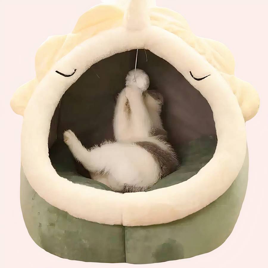 Le panier dinosaure en polaire pour chat a même un coussin intérieur. Le tout donne à votre animal une niche bien chaude et confortable.