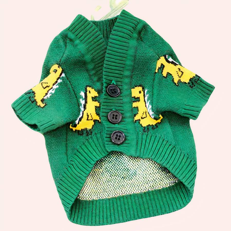 Ce pull boutonné vert à motif dinosaure pour chat est fabriqué entièrement en coton. Outre sa douceur exceptionnelle, il est aussi chaud et surtout sain pour votre petit compagnon.